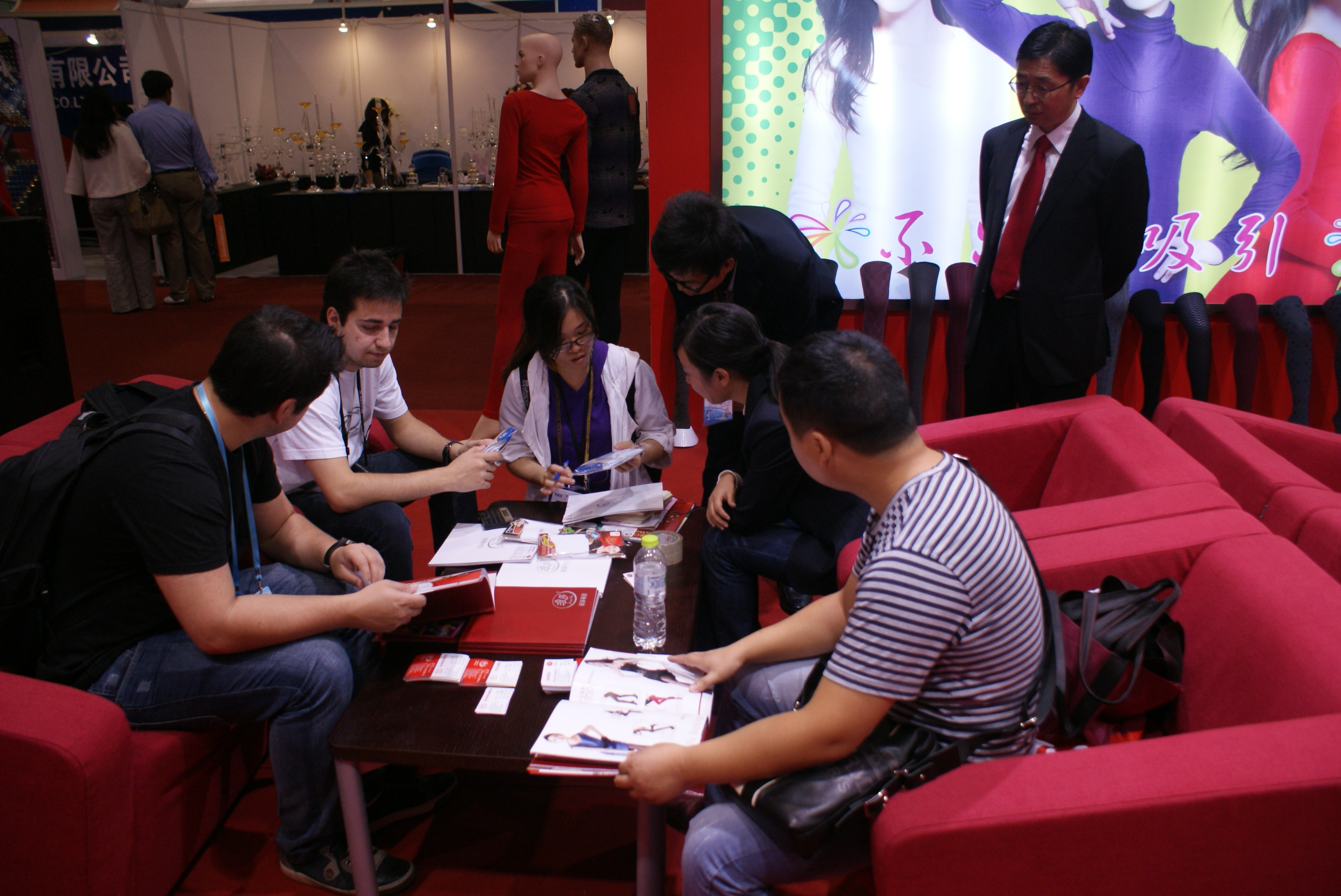 兩把小提琴助陣,浪莎紅Hold住全場。國內(nèi)外客商紛紛入內(nèi),參觀洽談,同事們忙的不亦樂乎。只要走進展位的即為我們的潛在客戶,本著專業(yè)的精神,我們都會微笑接待,因為我們清楚:“微笑服務(wù)才能贏得消費者的眷顧!”